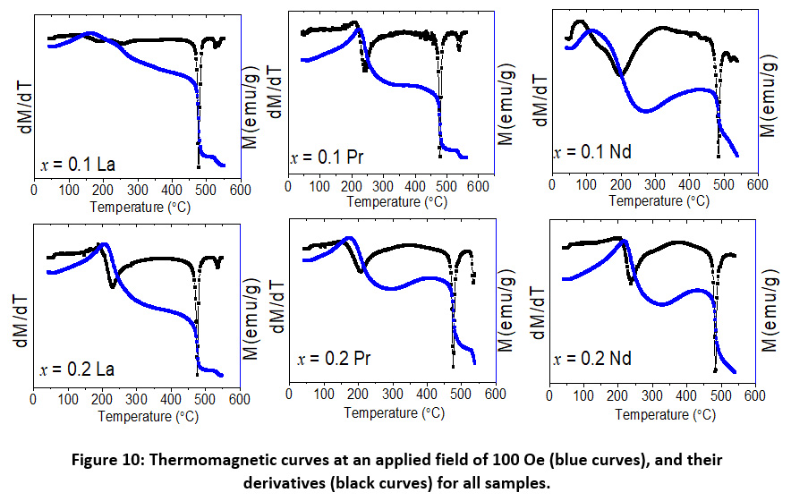 The behavior of the magnetization at a constants field of 100 Oe with increasing temperature was investigated for all samples, and the results are shown in Fig. 10. The curves indicated that all samples went through magnetic phase transitions at different temperatures. All thermomagnetic curves exhibited a peak below 300º C. The initial increase of the magnetization is associated with spin reorientation transition common to Co-containing W-type phase,16, 30 and the peak occurs as a result of competition with thermal effects. At higher temperatures (> 450° C), the magnetization dropped sharply as a consequence of ferromagnetic-to-paramagnetic phase transitions. The derivative of the magnetization with respect to temperature (dM/dT) exhibited a sharp (negative) peak at the transition temperature, from which the Curie temperature of the magnetic phase was determined (Table 4). The transition temperature obtained from the strong peak in the range 476 – 484° C is associated with the Curie temperature (Tc) of the W-type phase. These value of Curie did not change appreciably from the values previously reported for Co2W hexaferrite.26, 30 A second weak peak in the derivative curves was observed at higher temperatures (534 – 539° C). Since the structural analysis did not show secondary phases (except for the sample with Nd-Zn substitution with x = 0.1), this weak peak can be attributed to the enhancement of the superexchange interactions strength in Co-rich regions of the samples. Similar secondary step reduction of the magnetization was observed in the thermomagnetic curves of Co-containing M-type,46 Y-type,47 and W-type hexaferrites.16, 30
