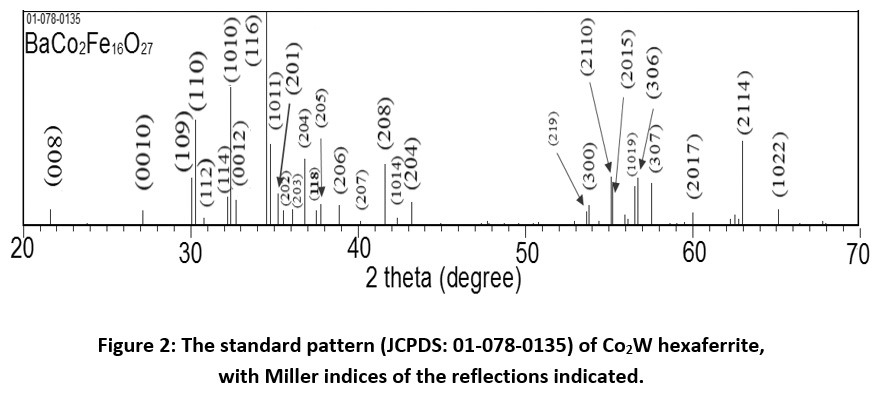 Figure 2: The standard pattern (JCPDS: 01-078-0135) of Co2W hexaferrite, with Miller indices of the reflections indicated.