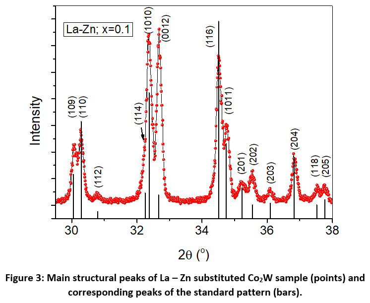 Figure 3: Main structural peaks of La – Zn substituted Co2W sample (points) and corresponding peaks of the standard pattern (bars).