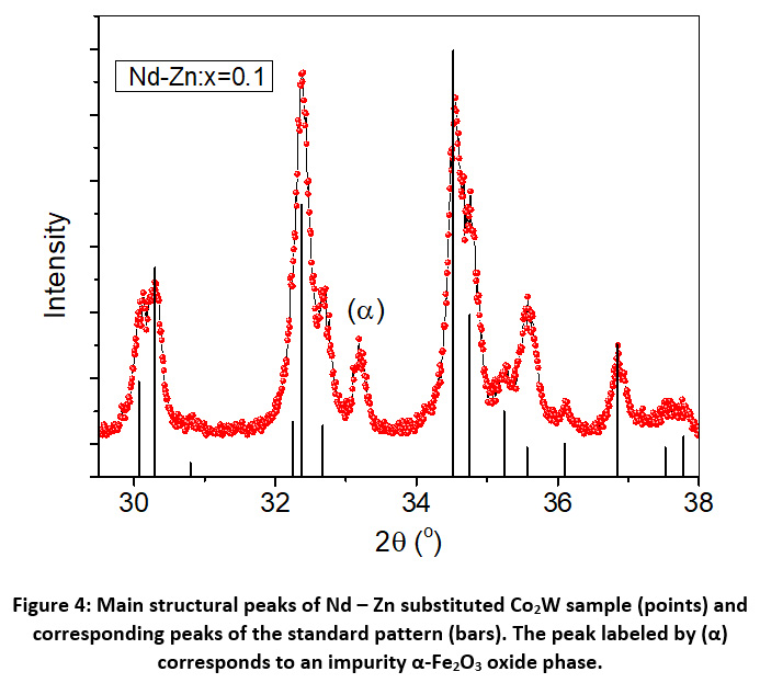 Figure 4: Main structural peaks of Nd – Zn substituted Co2W sample (points) and corresponding peaks of the standard pattern (bars). The peak labeled by (α) corresponds to an impurity α-Fe2O3 oxide phase.