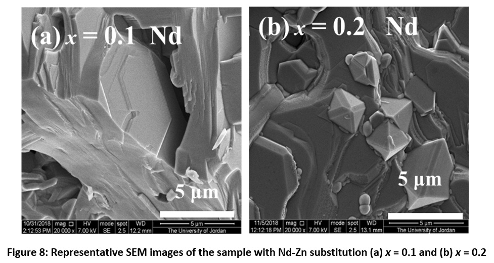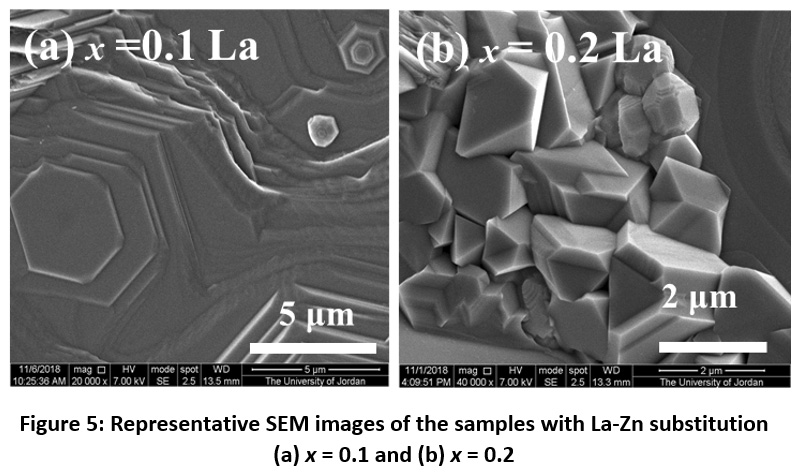 Fig. 6 shows representative SEM images of the sample with Pr–Zn substation (x = 0.1). The images show the presence hexagonal particles with in-plane size of ~ 1 – 2 μm in some regions of the sample (Fig.6 (a)), in addition to large non-particulate porous structure with hexagonal pores (Fig.6 (b)). The hexagonal pores revealed the internal crystallographic hexagonal structure in the large non-particulate mass.