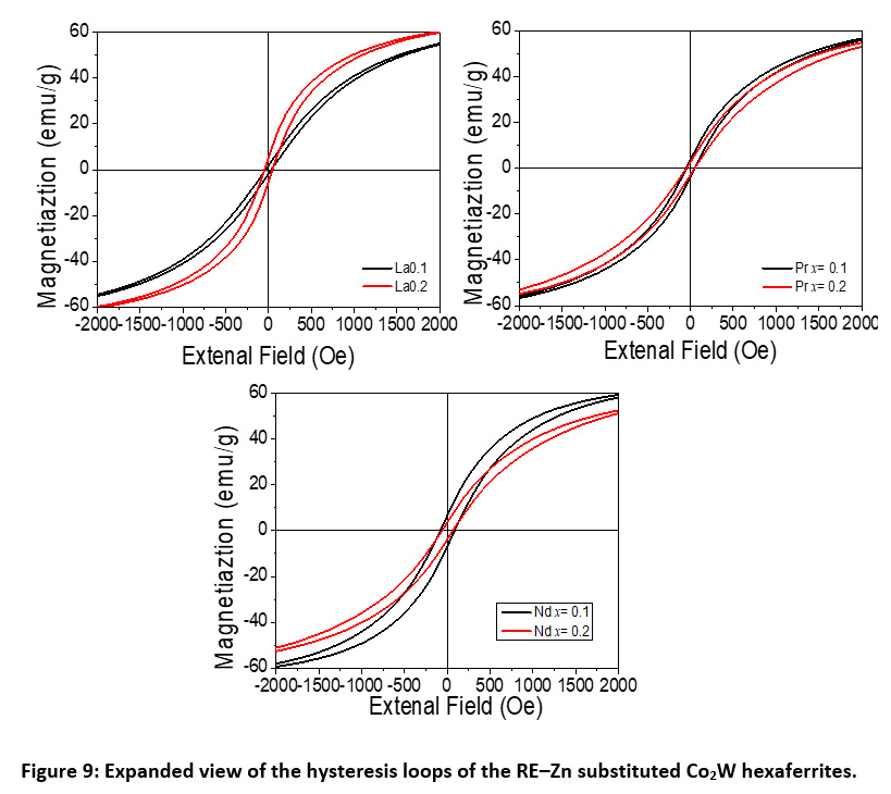 To examine the correctness of the interpretation provided in the last sentence, we must simultaneously investigate the behavior of the anisotropy field (Ha) with RE-Zn substitution, since it is known that changes in Ha play an important role in changing the coercivity. Table 3 shows that the values of Ha of all samples were in the range of 6.39 – 8.64 kOe, in agreement with the values for pure Co2W samples.16, 30 However, the sample with Nd-Zn substitution (x = 0.1) exhibited the lowest value of 6.39 kOe, whereas this same sample exhibited the highest coercivity. Also, the sample with La-Zn substitution (x = 0.1) exhibited the lowest coercivity of 33 Oe, whereas its anisotropy field is one of the highest in the measured samples. This could be an indication that the observed fluctuations in the coercivity are more likely to be of microstructural origin rather than magnetocrystalline origin.