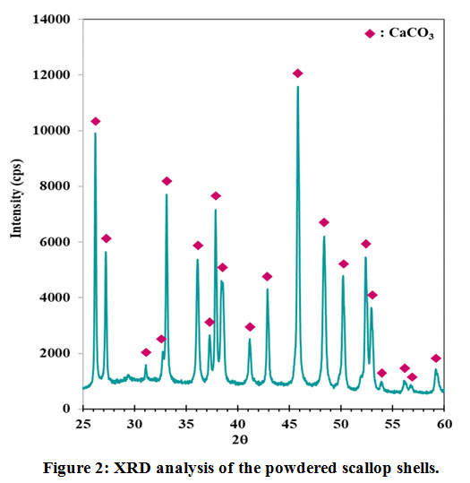 Phase analysis revealed that powdered as-received scallop shells contain only calcium carbonate phase (Fig. 2). This result is consistent with the literature reporting that scallop shells consist of calcium carbonate as an inorganic phase.41 Sawai et al.41  applied heat treatment to the scallop shells at 600°, 700°, 800°, 900°, and 1000°C for 1 hour. They reported XRD analysis results of the as-received and heat-treated scallop shells. Calcium carbonate was determined as an inorganic phase for the as-received and heat-treated scallop shells up to 700°C. 41 Sawai et al.41 reported that CaO was formed firstly at 800°C and at higher temperatures stronger CaO peaks were detected.