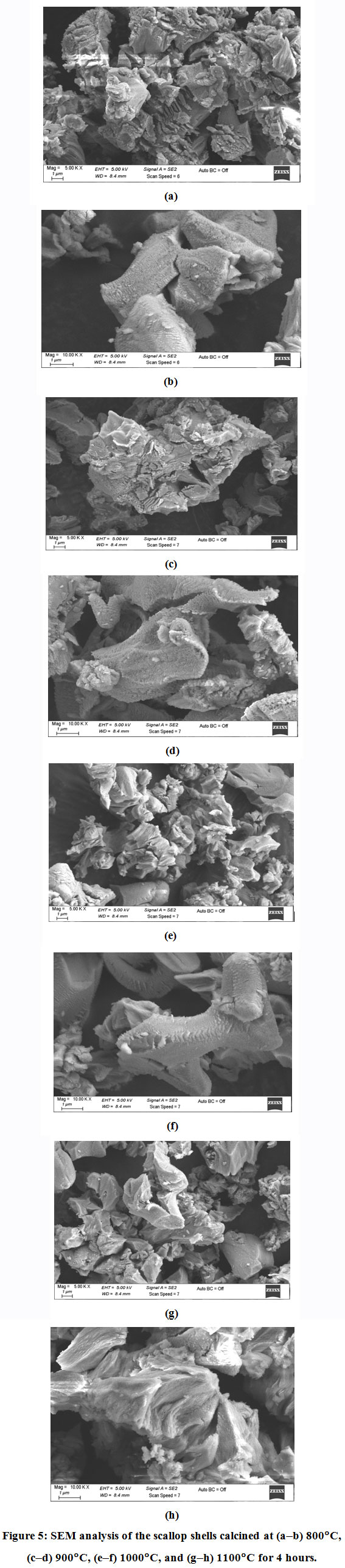 Scanning electron microscopy investigations of the heat-treated scallop shells (Fig. 5)revealed that the particle size and distribution of the obtained calcium hydroxide phase slightly depends on the applied heat treatment temperature. Micro structural investigations revealed that the particle size and distribution of the heat-treated samples are very fine and homogenous for all samples. These nano meter sized calcium hydroxide powders can be used as a starting material to synthesize various ceramic materials such as calcium silicates and calcium phosphates.