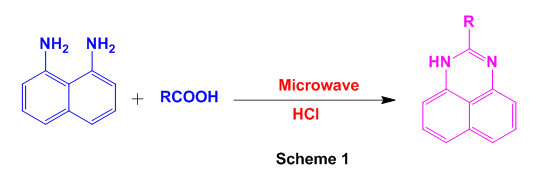 An acid-catalyzed reaction of carboxylic acids and 1,8-diaminonapthalene(Scheme 1) gives 2-substituted perimidine under microwave irradiation47.