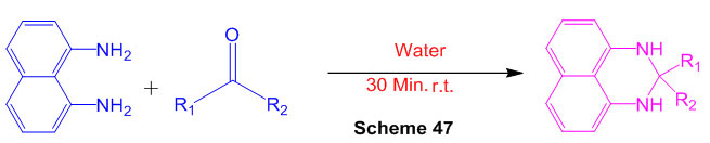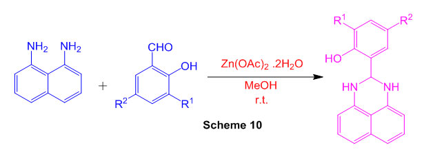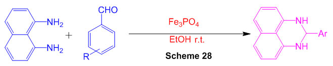 The response of 1,8-diaminonaphthalene with aromatic aldehydes gave 2-subbed perimidines within the sight of FePO4 as a flexible, green and reusable impetus at room temperature (Scheme 28)74.