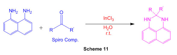 The reaction of naphthalene-1,8-diamine and active carbonyl compounds in water at room temperature showed InCl3 to be a mild and viable impetus for the simple and fruitful union of spiro-perimidine subsidiaries. (Scheme 11) 57.