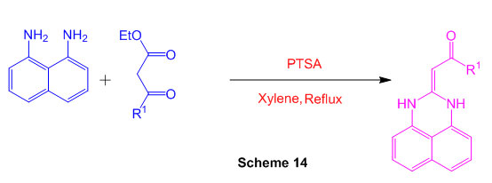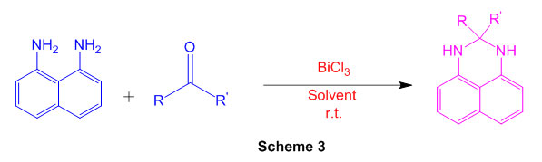 Various perimidine derivatives aresynthesized from naphthalene-1,8-diamine and variety of ketone functionality(Scheme 3) using catalyst BiCl3 49.