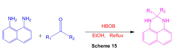 Using boric acid (HBOB) as a catalyst and ketone as a substrate, an efficient method for the synthesis of substituted perimidine derivatives is described (Scheme 15) 61.
