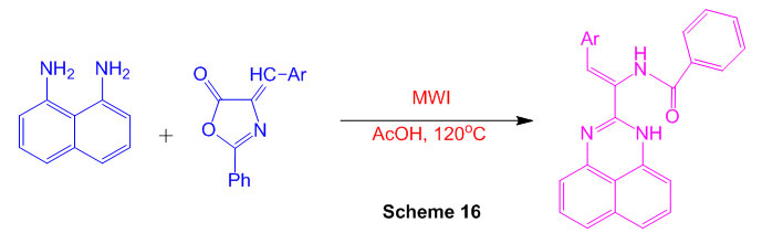 Another and proficient admittance to (Z)-N-(2-argio-1-(1H-perimidin-2-yl)vinyl)benzamide subsidiaries from promptly accessible substrates in HOAc is depicted with help of microwave irradiation (Scheme 16)62.