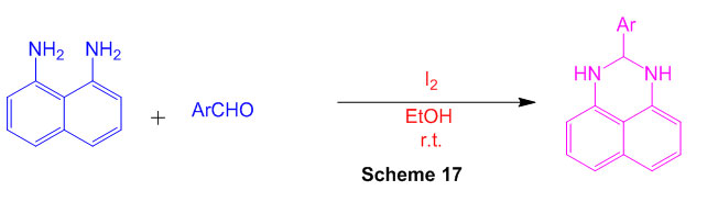 The reaction of 1,8-diaminonaphthalene and aromatic aldehydes in the presence of molecular iodine as a highly active catalyst yielded a few perimidines in high to exceptional yields (Scheme 17) 63.