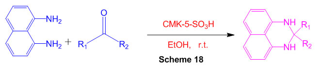 Using cyclocondensation of various aldehydes and ketones with 1,8-diaminonaphthalene in ethanol as a solvent at room temperature, sulfonated ordered nanoporous carbon effectively catalyses the synthesis of perimidines (Scheme 18) 64.