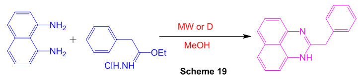 The reaction of 1,8-diaminonapthalene with iminoester hydrochlorides of substituted phenylacetic acids with microwave irradiation is identified for the synthesis of 2-substituted perimidines (Scheme 19) 65.