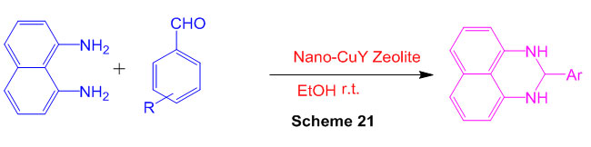Another technique for union of 2-aryl-2,3-dihydro-1Hperimidines by buildup of 1,8-diaminonaphthalene with a variety of aromatic aldehydes utilizing nano-CuY zeolite as catalyst, in ethanol, at room temperature (Scheme 21) 67.
