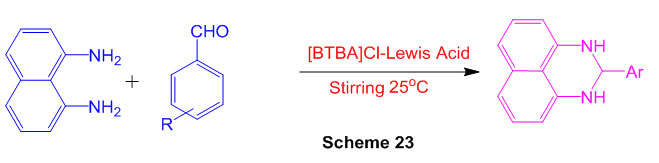 A successful union of different organically significant 2,3-dihydroperimidines from response of aldehydes and naphthalene-1,8-diamine has been created utilizing [BTBA] Cl-FeCl3 as an effective Lewis corrosive ionic fluid (Scheme 23) 69.