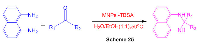Nanoparticles as an efficient catalyst for synthesis of mono-, bis-, tris- and spiro-perimidines have been reported (Scheme 25) 71.
