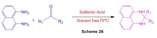 Gentle and relevant blend of mono-, bis-, and spiro-perimidines is exhibited in significant yields by means of the buildup of 1,8- diaminonaphthalene and aldehydes or ketones in presence of sulfamic acid as a green and exceptionally effective catalyst (Scheme 26) 72.