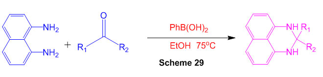 Synthesis of 2,3-dihydo-1H-perimidines subordinates was set up by considering a response between naphthalene-1,8-diamine and ketone within the sight of Phenyl boronic corrosive as an catalyst utilizing ethanol as a solvent (Scheme 29) 75.