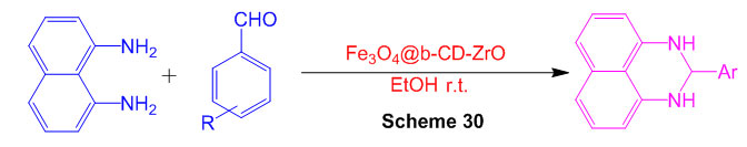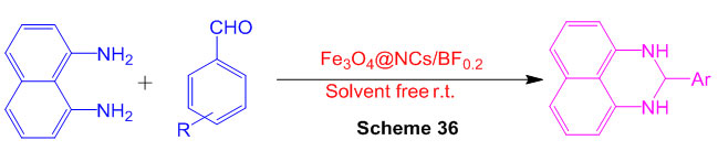 Fe3O4@NCs/BF0.2 was utilized for the amalgamation of 2,3-dihydro-1H-perimidine subsidiaries through a response of 1,8-diaminonaphthalene with different aldehydes at room temperature under dissolvable free conditions (Scheme 36) 82.