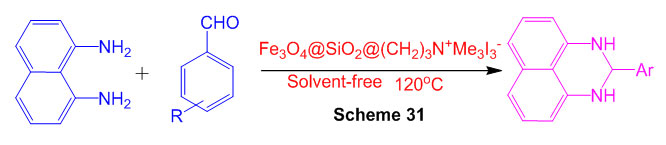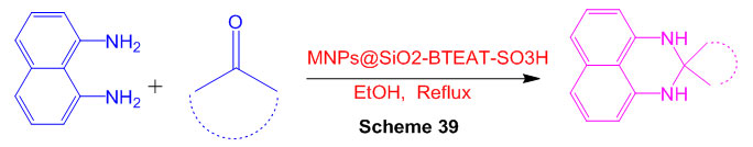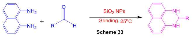 The reactant movement of SiO2 nanoparticles (NPs) as an eco-friendly, efficient and reusable impetus in the combination of 2,3-dihydro-1H-perimidines was found out (Scheme 33) 79.