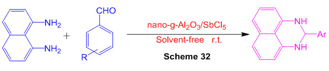 Nano-g-Al2O3/SbCl5 has been utilized for combination of 2-subbed perimidines by means of response of naphthalene-1,8-diamine with different aldehydes at room temperature under dissolvable free conditions (Scheme 32) 78.