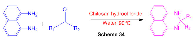 Proficient amalgamation of perimidine subordinates utilizing recently used chitosan hydrochloride was created (Scheme 34) 80.