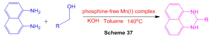 The Mn-catalyzed dehydrogenative amalgamation of primarily significant 2,3-dihydro-1H-perimidines has been illustrated (Scheme 37) 83.