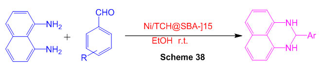 The synergist execution of Ni/TCH@SBA‐15 (NNTS‐15) was resolved for the amalgamation of 2,3‐dihydroperimidines (Scheme 38)84.