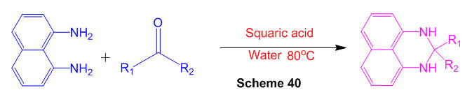 Squaric acid, a green, without metal and eco-accommodating organocatalyst, has been abused for the union of organically fascinating 2,3-dihydro-1H-perimidines (Scheme 40) 86.