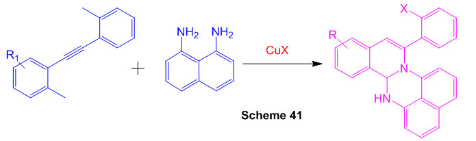 An epic amalgamation of profoundly combined perimidine subsidiaries was accomplished in two stages from 2-alkynylbenzaldehydes. Copper-catalyzed annulation of 2-[(2bromophenyl)ethynyl]benzaldehydes with 1,8-diaminonaphthalene created dihydroisoquinolino[2,1-a]perimidines (Scheme 41) 87.