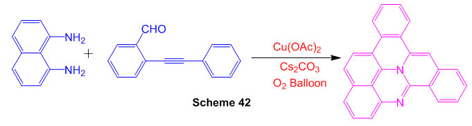 A Cu(OAc)2-catalyzed chain reaction tricyclization of naphthalene-1,8-diamine and 2-(phenylethynyl) benzaldehyde is described, allowing oxygen-consuming oxidative dehydrogenation coupling to heptacyclic quinolizin o[ 3,4,5,6-kla]perimidines to be obtained Scheme 42)88.