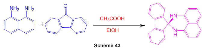 Spiro[1,3-dihydroperimidine-2,9-fluorene] and its co-crsytal with 9-fluoreone have been synthesized with the help of acetic acid as a catalyst (Scheme 43) 89.