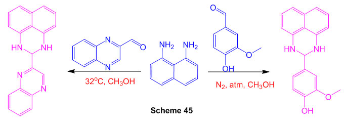 A active one-pot mix of two new heterocyclic perimidines, 4-(2,3-dihydro-1H-perimidin-2-yl)-2-methoxyphenol and 2-(2,3-dihydro-1H-perimidin-2-yl)-2-methoxyphenol and 2-(2,3-dihydro-1H-perimidin-2-yl)-2-meth (quinoxalin-2-yl) – Strong yields of 2,3-dihydro-1H-perimidine are produced. (Scheme 45)91.