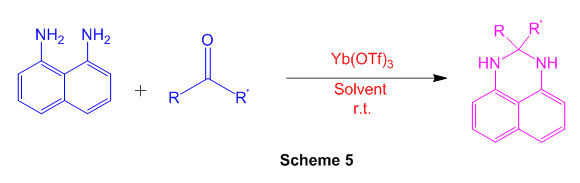 Different organically significant perimidine subordinates have been effectively orchestrated in amazing yields utilizing naphthalene-1,8-diamine with different ketones (Scheme 5) within the sight of a synergist measure of Yb(OTf)3 51