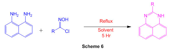 Another course to perimidines has been created which includes response of a 1,8-diaminonaphthalenewith chloro oxime derivative (Scheme 6) 52