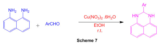In the presence of a catalytic volume of Cu(NO3)2.6H2O in ethanol at room temperature, some perimidine subordinates is mixed by condensation reaction of 1,8 diaminonaphthalene and aromatic aldehydes. (Scheme 7) 53