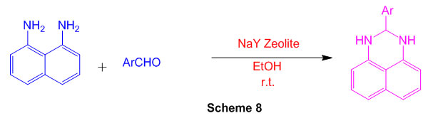 Perimidines are produced by reacting 1,8-diaminonaphthalene with aromatic aldehydes at room temperature in the presence of NaY zeolite. (Scheme 10) 56.