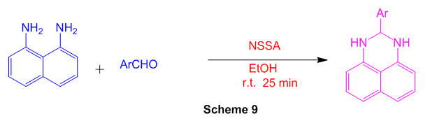 The cyclocondensationmethod of various aromatic aldehydes with 1,8diaminonaphthalene in the presence of nano-silica sulfuric acid (NSSA) as a catalyst has been used to create a reliable and direct method for the synthesis of perimidine subordinates. (Scheme 9) 55.