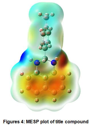 The optimized molecular structure of the title molecule is given in Figure 1. Table 2 shows the optimized geometric parameter bond lengths by B3LYP with the 6-311G(d,p) basis set. The B3LYP method is well known for predicting geometrical parameters that are closer to experimental results, as discussed in the literature 55. B3LYP/6-311G(d,p) is taken into consideration for these purposesin the present discussion.The information about bond lengths is very crucial to get insights into inter and intra molecular interactions, hydrogen bonding effects and also chemical reactivity patterns56-58.For the title compound, the bonds C5-N35 and C8-N33 are having 1.4157 Å and 1.3979 Å respectively. This will makenitrogen atom of C5-N35bond better nucleophile since the bonding electrons are more polarized due to longer bond length.When acidic nature of H34 and H36 is compared, it is observed that H36possessmore acidic strength which is supported by their bond lengths and Mulliken atomic charge values. The bond length values of N33-H34 and N35-H36 bonds are 1.0139 Å and 1.0142 Å respectively. In the naphthalene ring of the TDHP compound, C1-C2 andC7-C10 bonds possess nearly same bond lengths and importantly these two bonds are found to contain maximum double bond character and thereby render electrophilic aromatic substitution reactions more probable at these bonds.The C2 and C9 positions are more prone towards electrophilic attack. In this way the knowledge about bond length values provides valuable insights into physical and chemical properties of the TDHP compound.