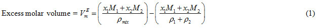 Here Χ1 and Χ2 are mole fractions; M1 and M2 are molar masses; P1 and P1 are densities of ethyl acetate and 1-ethanol respectively. P is the density of liquid mixtures.