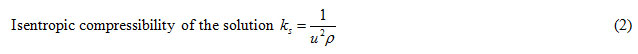 The experimental observations of density (P), ultrasonic velocity (U), and the calculated the isentropic compressibility of the entire concentrations of ethyl acetate and 1-ethanol are listed in Table1. In this study, the density (ρ) of the liquid mixtures increased with the ethyl acetate concentrations. Moreover, densities decreasing with increase the experimental temperature. This trend suggested the dissociation of the dipoles in the liquid system.