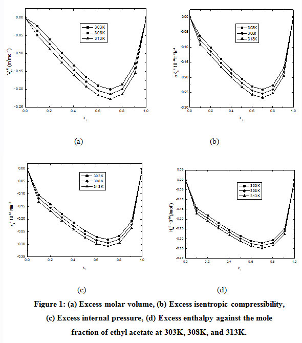 The deviations of the excess molar volume ( VmE ), excess isentropic compressibility ( ΔksE ), excess internal pressure ( πiE ) and the enthalpy ( VmE ) at 303K, 308K, and 313K are plotted against the mole fraction of ethyl acetate as displayed in Fig 1(a-d) respectively.