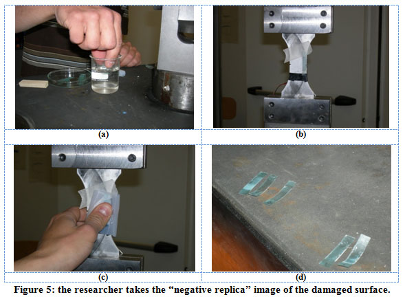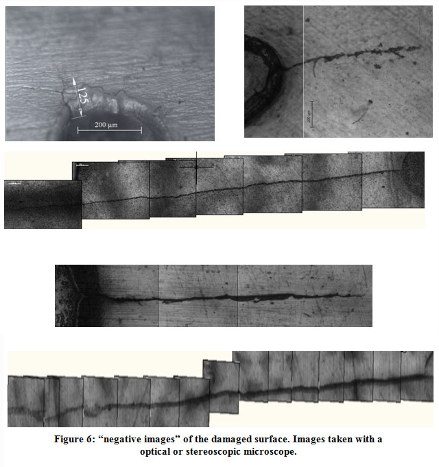 The behavior at the defect gage section can be monitored by using a certain kind of “negative image” of the damaged surface. Researchers can use acetate strips having small thickness (in the range 0,1-0,2 mm). Acetate strips have to be immerged in acetone for a few seconds and then accurately pressed on the damaged surface (Figures 4 and 5).