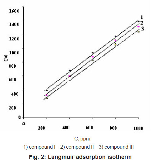 where K is the adsorption constant. Plotting Cθ against C gave a straight line with unit slope value (Fig. 2) indicating the adsorption of ethoxylated fatty alcohols on the steel surface follows Langmuir adsorption isotherm. From these results one can postulates that there is no interaction between the adsorbed species.