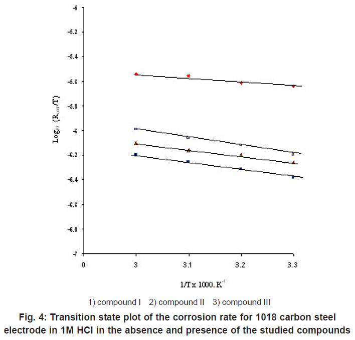 where N is Avogadro’s number, h is planck’s constant. A plot of log (Rcorr/T) vs (1/T) (Fig.4) should give straight line with a slope of (-ΔH*/2.303 R) and an intercept [log (R/Nh -Δ So / 2.303R)]. The values of DH* obtained from the slope of the straight line equal 10.253 KJ mol-1 in 1M HCl and equal 13.188, 17.213 and 19.220 KJ mol-1 in presence of compound I, II and III, respectively.