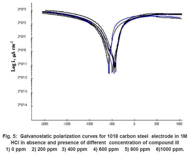 Figure 5:  Galvanostatic polarization curves for 1018 carbon steel  electrode in 1M HCl in absence and presence of different  concentration of compound III 1) 0 ppm    2) 200 ppm   3) 400 ppm    4) 600 ppm    5) 800 ppm    6)1000 ppm.
