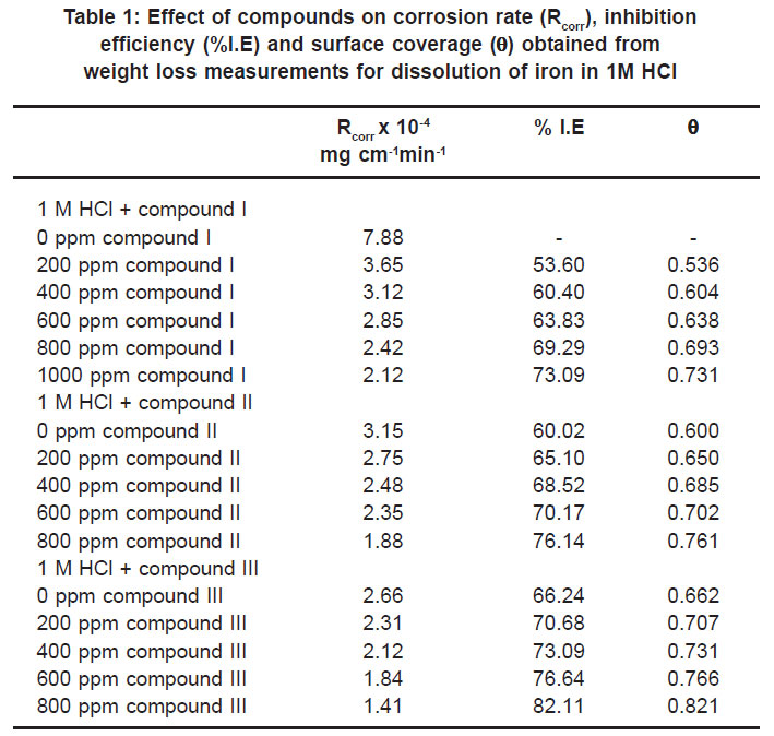 Table 1: Effect of compounds on corrosion rate (Rcorr), inhibition efficiency (%I.E) and surface coverage (θ) obtained from weight loss measurements for dissolution of iron in 1M HCl