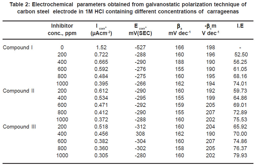 Table 2: Electrochemical parameters obtained from galvanostatic polarization technique of carbon steel electrode in 1M HCl containing different concentrations of carrageenas