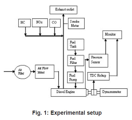 The test engine used for the present investigation is a single cylinder, 4-stroke, water cooled and naturally aspirated direct injection compression ignition engine. The loading of the engine is done by eddy current Dynamometer. The technical specifications of the engine are shown. The engine is of constant speed (1500 rpm) type with a fluctuation of ± 25 rpm. Time taken for 50 cc of fuel consumption was measured with the aid of burette and stop watch arrangement. Krypton 290 EN2 gas analyzer was used to measure the concentration of Carbon monoxide, Hydrocarbon, and Oxides of nitrogen. Smoke levels were measured using a standard smoke meter in Bosch Smoke unit. The combustion pressure was measured using pressure sensor in the cylinder head and the crank angle is obtained to a minimum scale reading of 1° for crank angle. Three readings are taken at each stage to ensure accuracy and the average value is recorded. All the measurements were recoded for 6% blending level of three oxygenated compounds. Fig.1 shows the schematic outline of experimental setup. Initially engine tests were performed using diesel fuel for all engine loads followed by oxygenated blends to measure the combustion, performance and pollutant emissions.