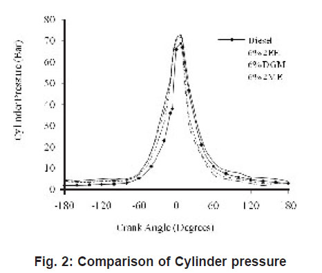 2ME blend increases the peak pressure and heat release rates compared to diesel fuel. Addition of DGM and 2EE blends with diesel decreases the peak pressure and heat release rates.